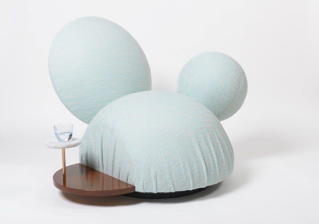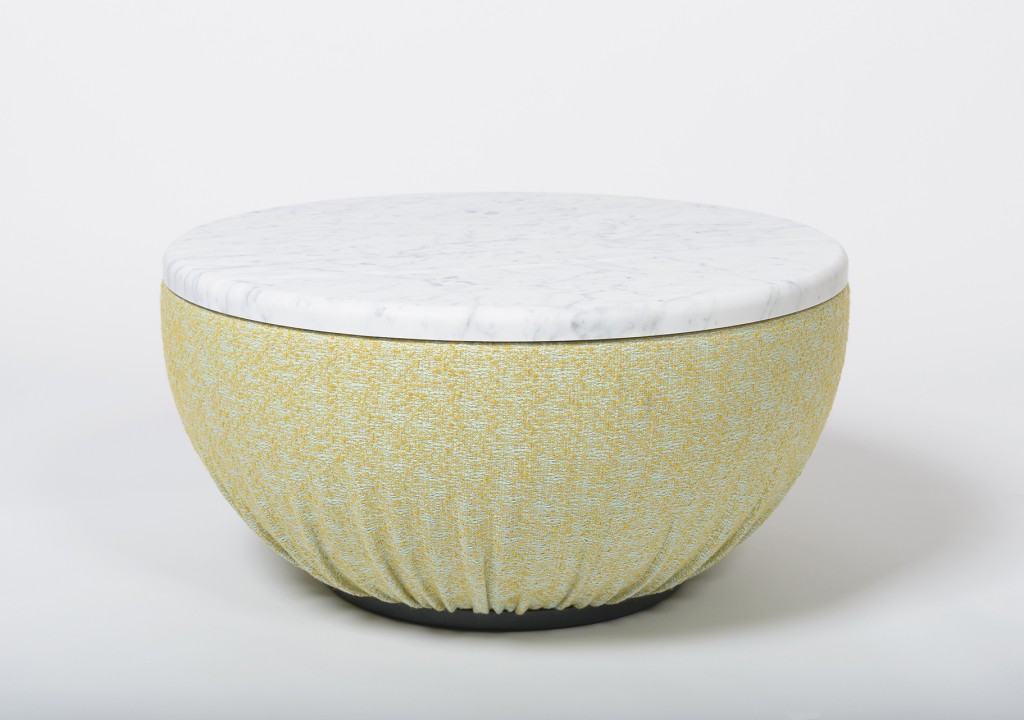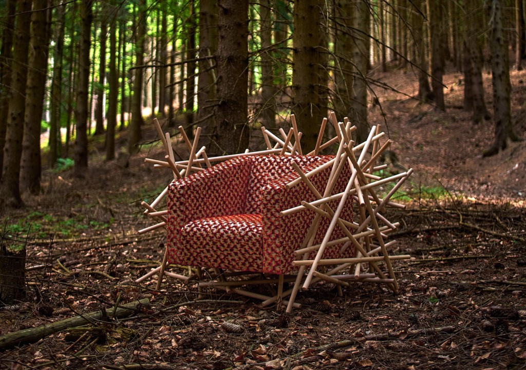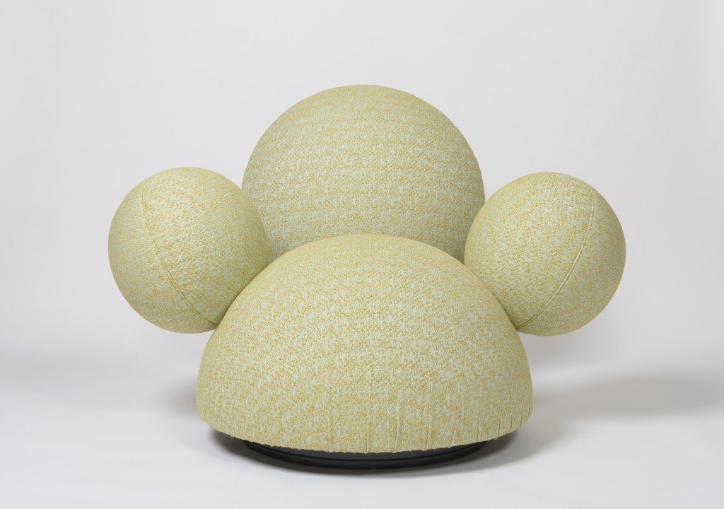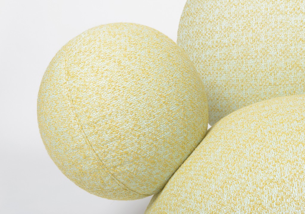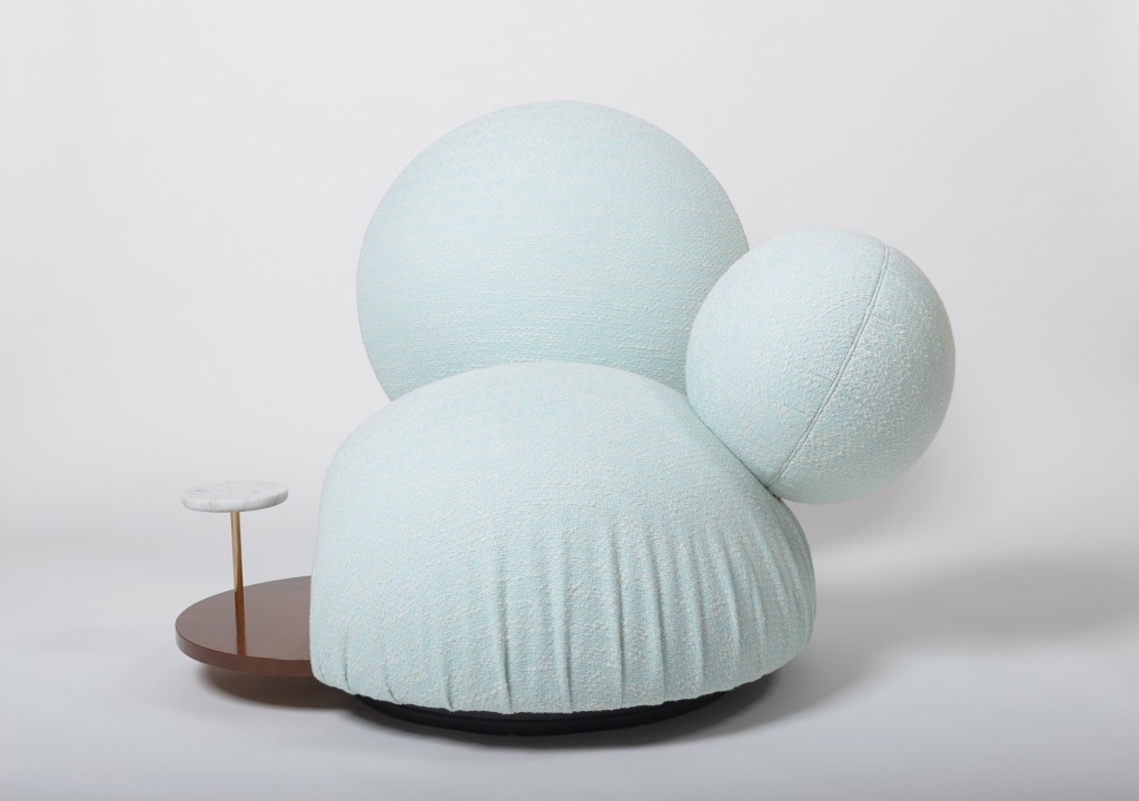 Ein gerader Schnitt durch den größeren der beiden Kugelkörper erzeugt eine halbkugelförmiges Sitzkissen und eine Kugelkalotte als Rückenlehne. Das Sitzkissen scheint über dem Boden zu „schweben“ und lässt sich durch einen zentralen Drehmechanismus 360° in alle Richtungen drehen. Der andere Teil, die Rückenlehne, ist an die Sitzfläche „angelehnt“ und unsichtbar verbunden. Der kleinere Kugelkörper wird zur „Armlehne“ und ermöglicht, dank seiner asymmetrischen Position, auch andere, ungewöhnliche Sitzpositionen. Ein kleiner Tisch und eine erhöhte Abstellfläche erweitert das Platzangebot des ungewöhnlichen Möbels. Copyright: Nathan Murrell