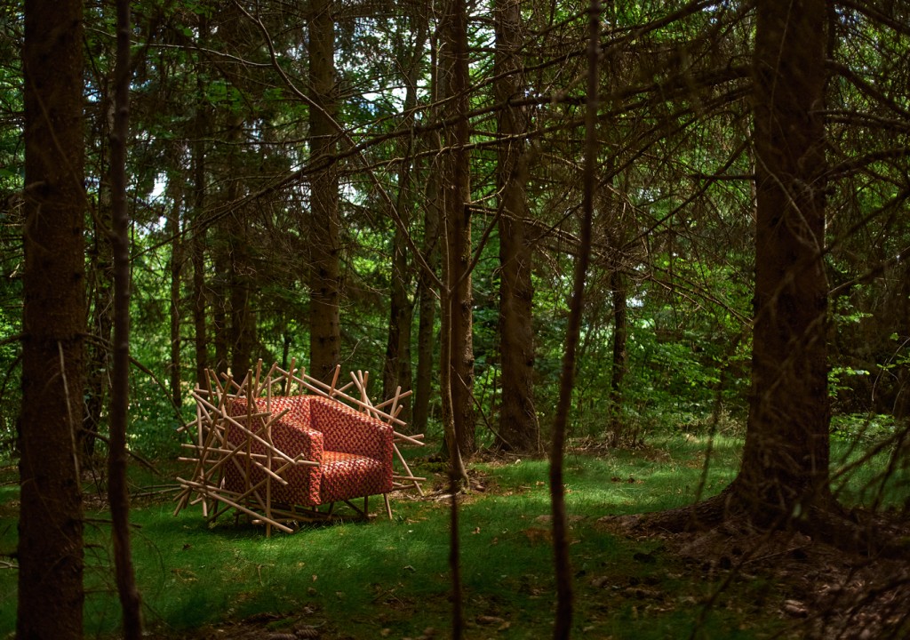 Der Name HORST bezieht sich auf ein mit „Zweigen“ zusammengefügtes „Nest“. Ausgehend von dieser Assoziation formen 61 Stäbe eine homogene schützende Konstruktion um einen darin befindlichen Würfel, als geometrische Idealfigur menschlicher Vermessung. Daraus entsteht eine Symbiose aus Mensch, Geometrie und Natur. Geborgenheit, Rückzug und Regeneration sind Grundbedürfnisse. Copyright: Maximilian Wessely